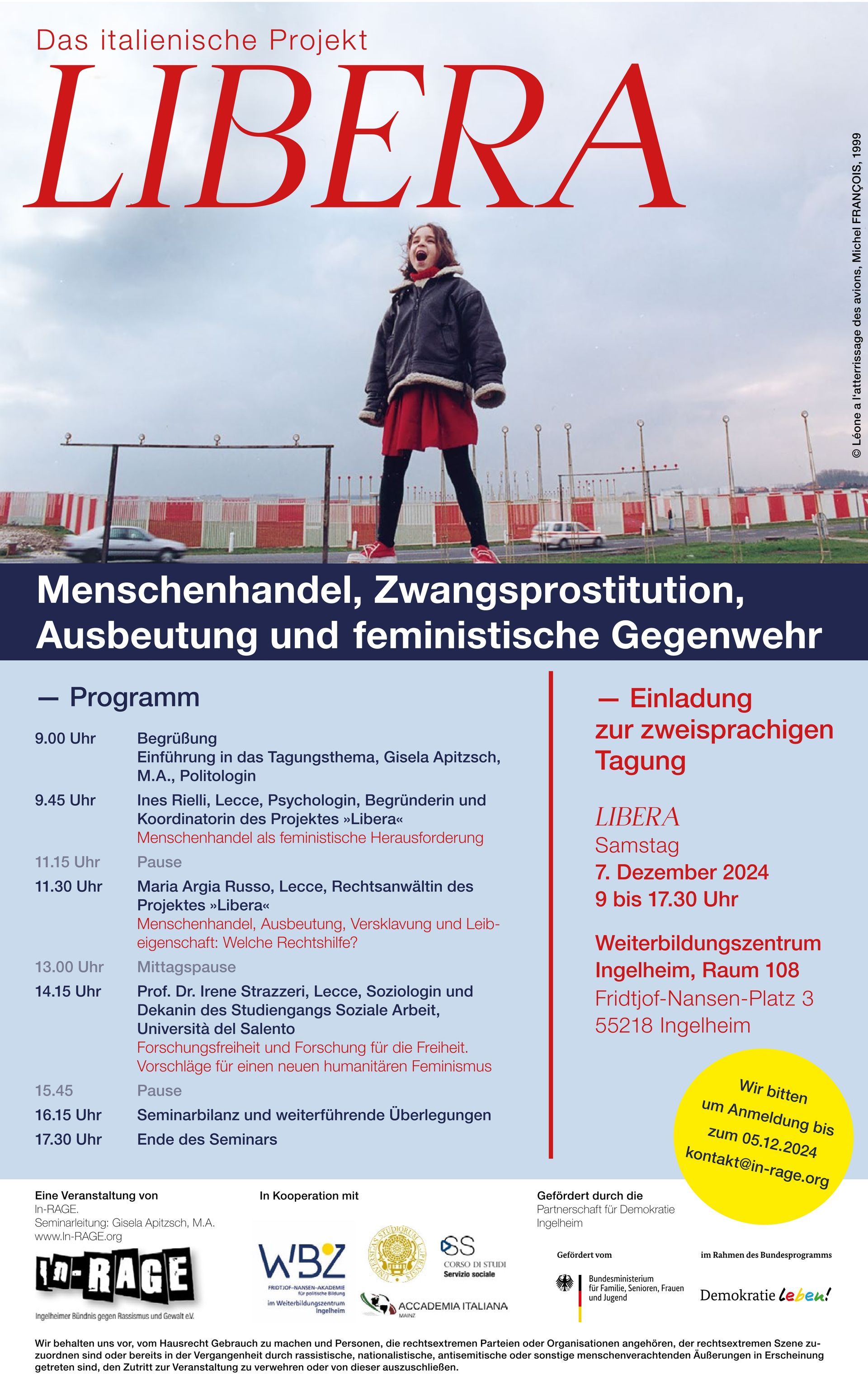 Bereits im Jahr 2000 fand sich in der süditalienischen Universitätsstadt Lecce eine multiprofessionelle, siebenköpfige Gruppe von Frauen zusammen, die ein neues Konzept der sozialen Arbeit mit von Menschenhandel Betroffenen konzipierte und selbst gemeinsam über 17 Jahre lang in der Provinz sehr erfolgreich realisierte. Als das Projekt von einem Tag auf den anderen „aus politischen Gründen“ eingestellt wurde, entschlossen sich die Frauen, ihre Erfahrungen und Einsichten zu Menschenhandel, Gewalt und Ausbeutung und ihren Protest gegen die erzwungene Beendigung ihrer Arbeit öffentlich zu machen. Das so entstandene Buch „Libera – Libere“ ist in Italien viel diskutiert und preisgekrönt. Die konsequent umgesetzten feministischen Überzeugungen der Autorinnen können einen wichtigen Beitrag auch für die aktuelle deutsche Diskussion um notwendige Verbesserungen der sozialen Arbeit im Handlungsfeld der Bekämpfung von Menschenhandel darstellen. Diese werden von der Psychologin und Projektgründerin, Ines Rielli, der Anwältin des Projektes, Maria Argia Russo und der ebenfalls selbst am Projekt beteiligten Soziologin und Dekanin des Fachbereichs „Soziale Arbeit“ der Universität des Salento, Irene Strazzeri auf der vom Ingelheimer Bündnis gegen Rassismus und Gewalt (In-RAGE e.V.) organisierten Tagung vorgestellt.