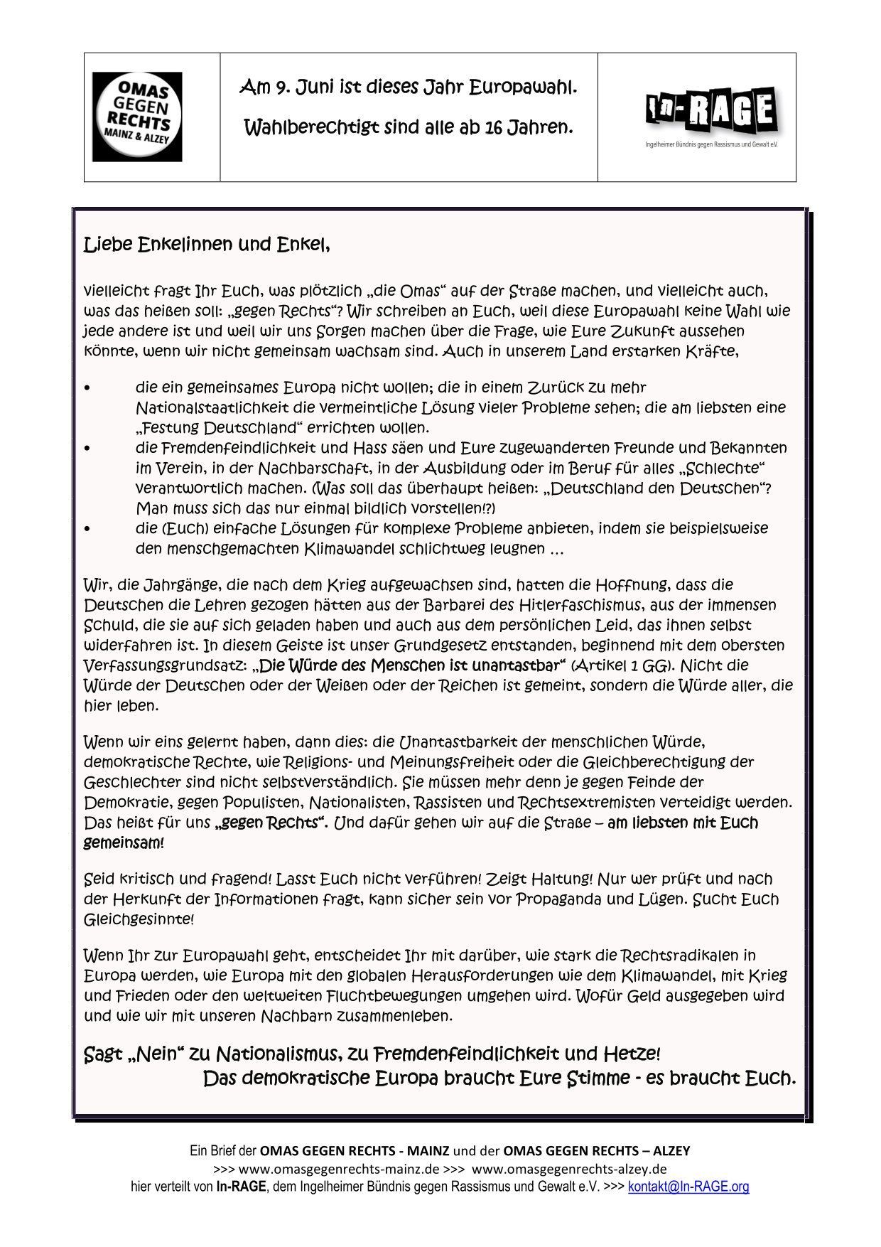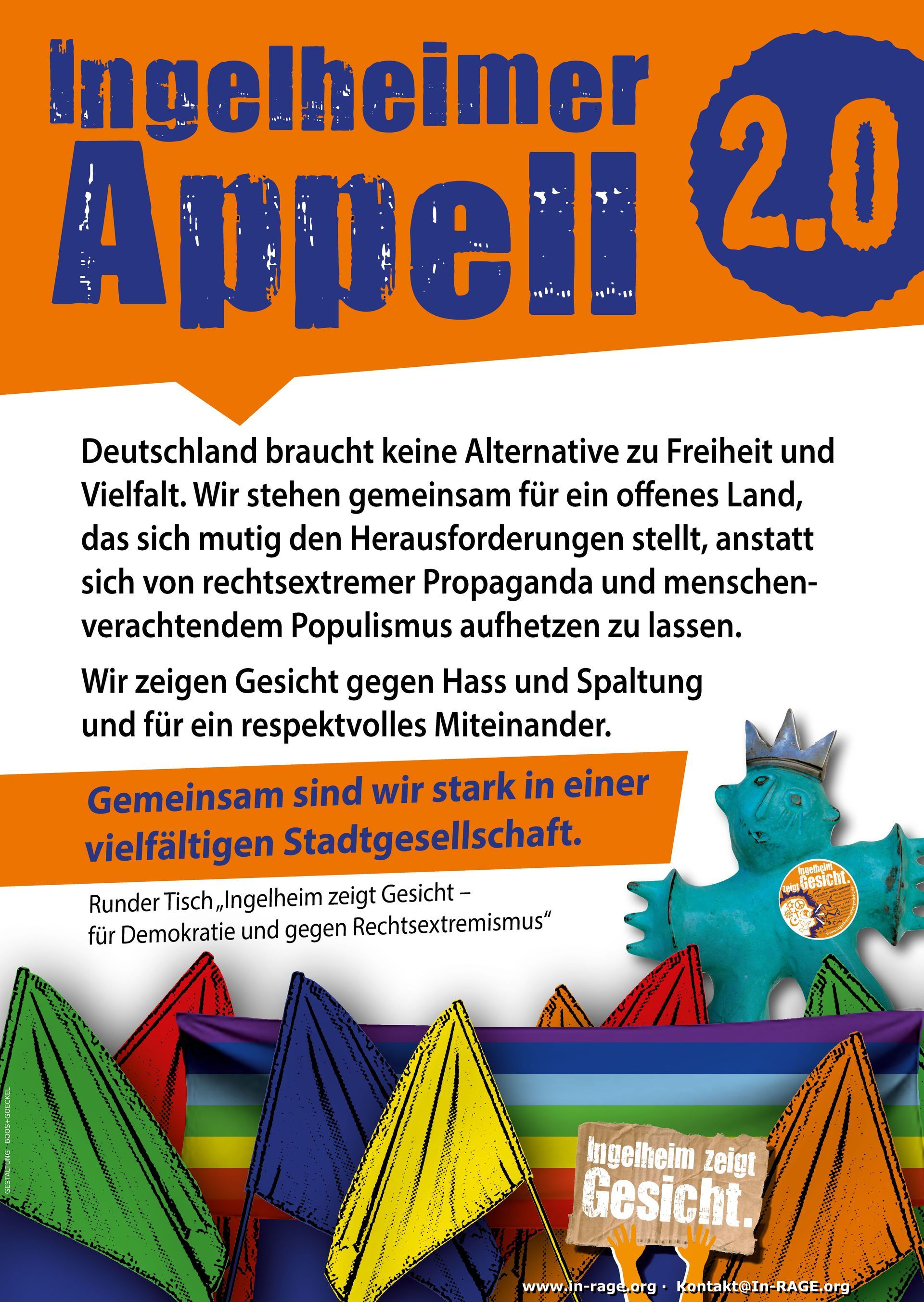 Die Ingelheimer Oberbürgermeisterkandidat*innen (Eveline Breyer, Sybille Schäfer und Stephen Heiser) und In-RAGE unterstützen ausdrücklich den Ingelheimer Appell 2.0 setzen damit gemeinsam ein klares Zeichen gegen Rassismus, Diskriminierung und Gewalt. Anfang 2024 wurde auf Initiative des Ingelheimer Bündnisses gegen Rassismus und Gewalt der „Runde Tisch der Stadt Ingelheim für Demokratie und gegen Rechtsextremismus“ gegründet. Dort trafen sich unterschiedliche Akteur*innen der Stadtgesellschaft, um über gemeinsame Strategien gegen Rechtsextremismus und -populismus zu sprechen und Handlungsansätze zu formulieren. Aus dem Austausch entstand der „Ingelheimer Appell 2.0: Demokratie schützen – Rechtsextreme stoppen“, ein gemeinsames Statement, das die demokratischen Werte betont und klare Position gegen rechtsextreme Ideologien bezieht.