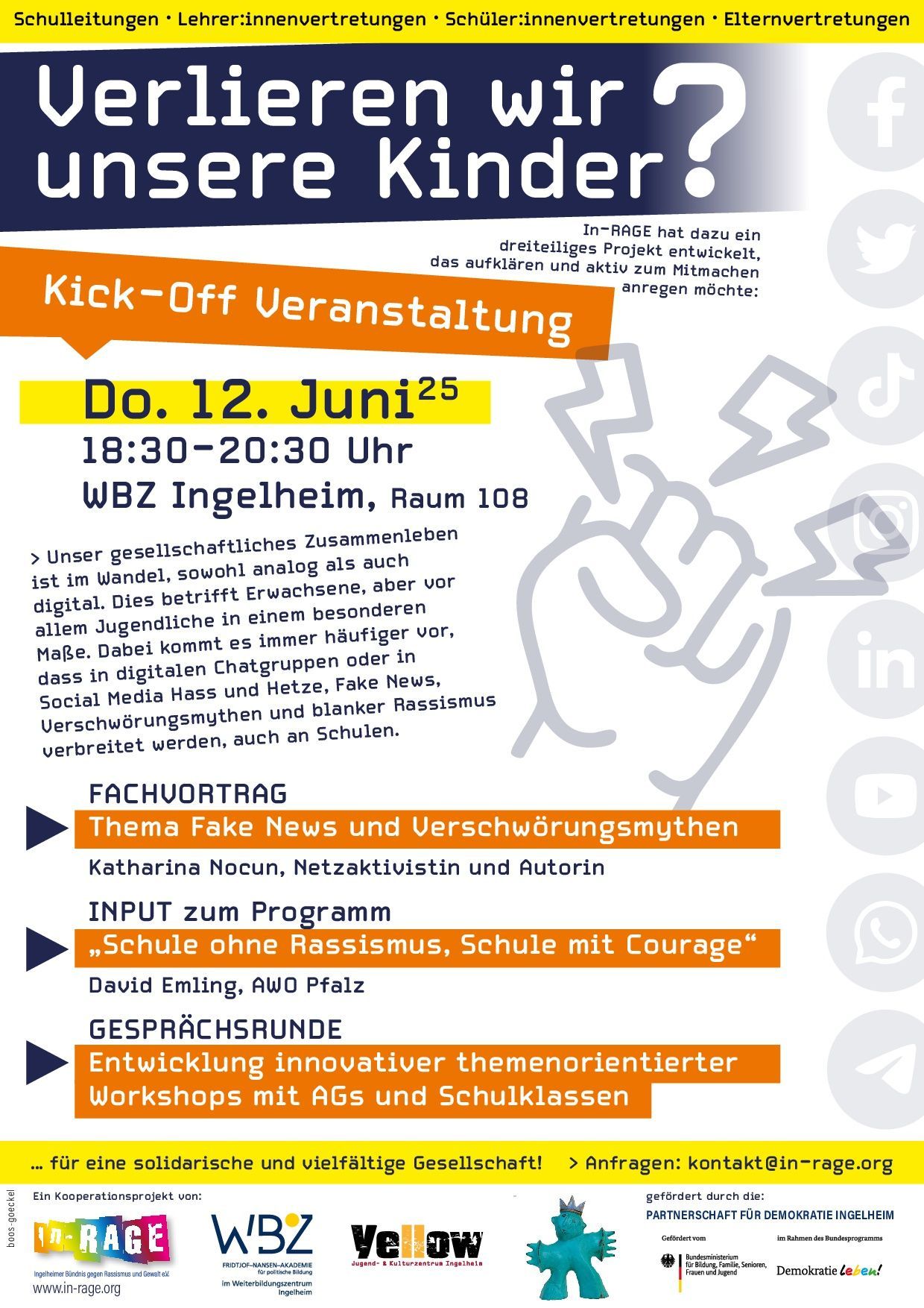 Am 12.06.2025 findet eine Kick-Off Veranstaltung im Weiterbildungszentrum Ingelheim statt, bei der die bekannte Publizistin Katharina Nocun einen Fachvortrag zum Thema halten wird. Danach wird es einen Input zum Programm „Schule ohne Rassismus, Schule mit Courage“ geben, bevor im Anschluss die zweite Projektphase gemeinsam besprochen und geplant werden soll. Nach den Sommerferien werden dann innovative Workshops mit AGs und Schulklassen stattfinden, um die Thematiken mit den Jugendlichen zu vertiefen. Ende des Jahres werden die Ergebnisse dann gemeinsam präsentiert und reflektiert. Zudem soll gemeinsam geschaut werden, ob in den kommenden Jahren ähnliche Projekte mit den Schulen zu weiteren Themenfeldern stattfinden könnten.